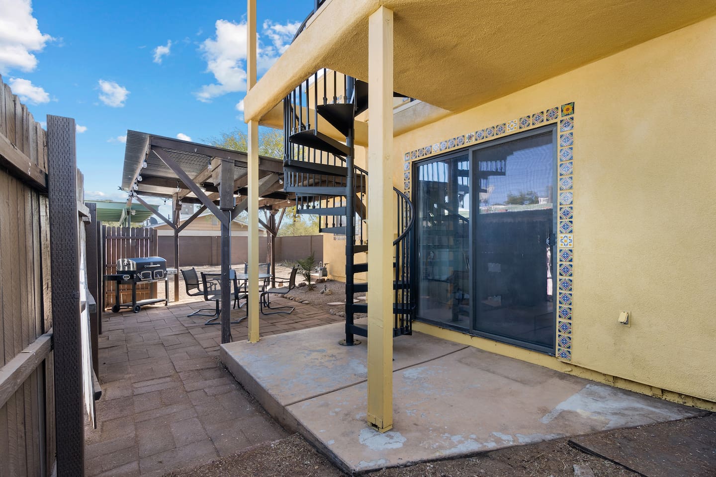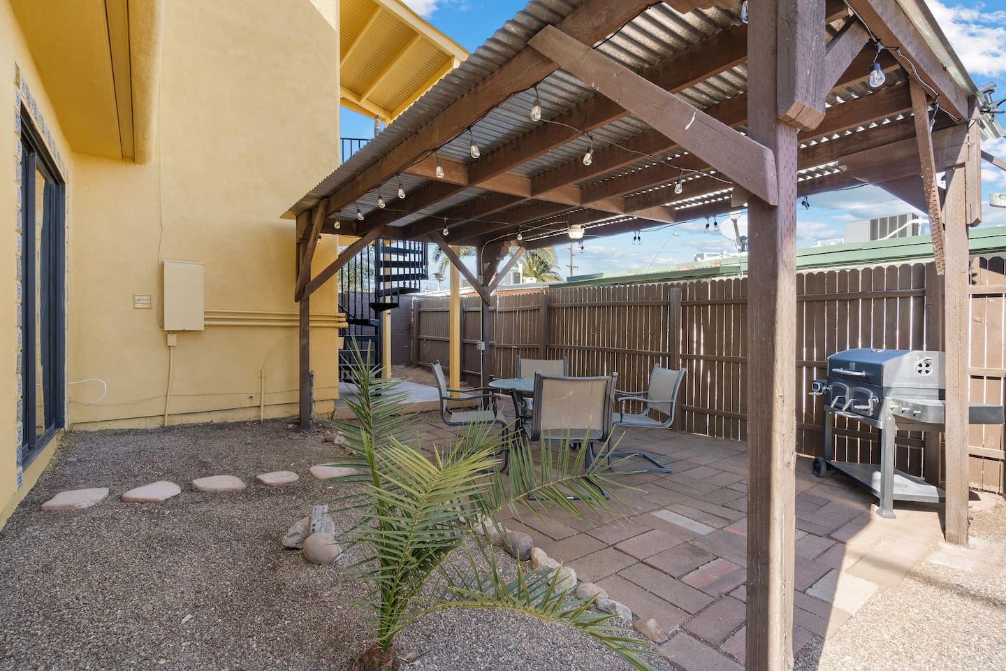 Flexible Layout: Upstairs features one bedroom with a hybrid mattress, a living room, kitchen, bathroom, and a cozy dinette area, while the second bedroom is located downstairs. The downstairs space includes a pull-out sofa bed and desk, as shown in the photos, making it perfect for work or relaxation. The upper and lower levels are connected ONLY BY AN OUTDOOR STAIRCASE, so guests must go outside to access the lower level. Since the kitchen, bathroom, and master bedroom are on the upper level, this house MAY NOT BE SUITABLE for those with ACCESSIBILITY NEEDS. Rooms & Spaces: Bedrooms: The upstairs bedroom features a high-quality mattress, blackout curtains, and cozy linens, ensuring a restful night’s sleep. The downstairs bedroom is accessible via an outdoor staircase. It features a comfortable queen-size pull-out sofa bed with high-density foam cushions. The room is also equipped with blackout curtains, cozy linens, and an office space. Office Space: A dedicated office space comes equipped with a desk, second monitor, and high-speed internet—ideal for remote work or study. Kitchen: The fully stocked kitchen is ready for all your culinary needs, complete with modern appliances, cookware, and dinnerware. Living Areas: Comfortable seating and 60" smart TVs in both the upper level living room and lower level living space offer a welcoming atmosphere that makes it easy to relax and unwind after a busy day. Outdoor Area: The large fenced yard includes a shaded dining area, BBQ grill, and plenty of space for pets or outdoor activities. Laundry: On-site washer and dryer provide added convenience. With air conditioning and all the amenities you could ask for, this property blends comfort and practicality for your extended stay.